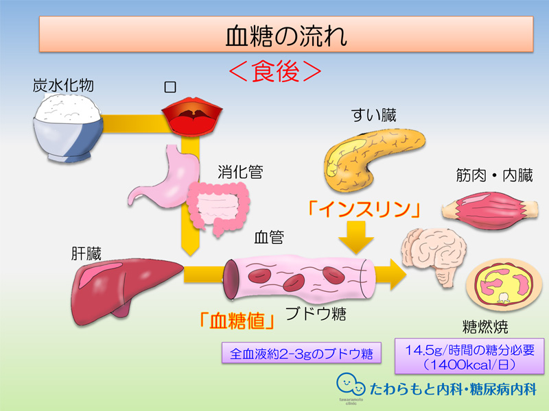 血液中を流れている糖分を血糖(細かく言うとブドウ糖です)と呼びます。食後は、食事や飲み物の炭水化物(でんぶん、果糖、砂糖など)が口から体内に入り、胃や腸で消化・吸収され、全身の血管を血糖として流れます。それを数値で表したものが血糖値です。