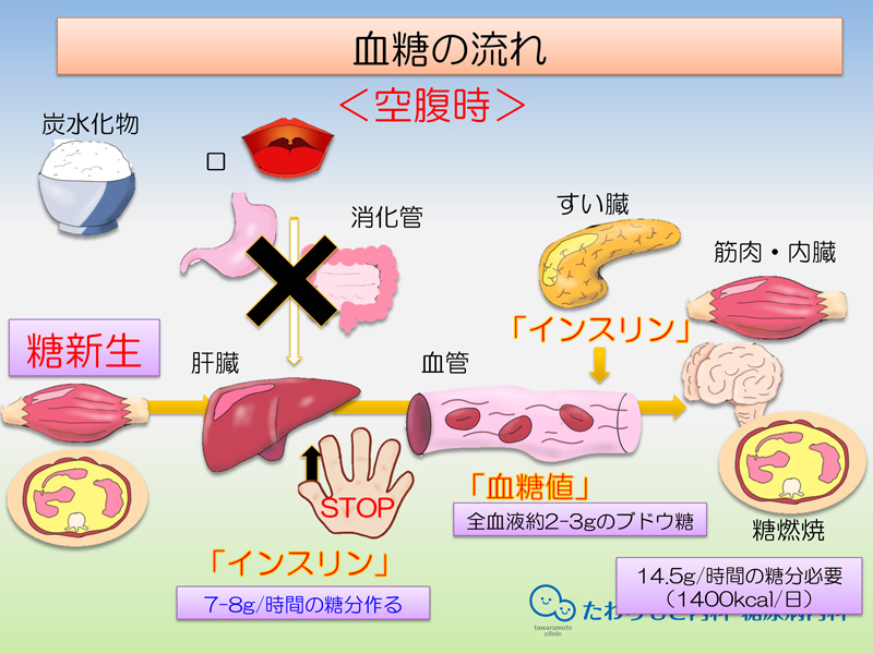 空腹時は全身の脂肪や筋肉の組織を少しずつ分解して、肝臓がそれを元に血糖を作り、全身に流します。これを糖新生と呼びます。インスリンは肝臓の糖新生を調節し、空腹時血糖値が上昇しすぎないようします。