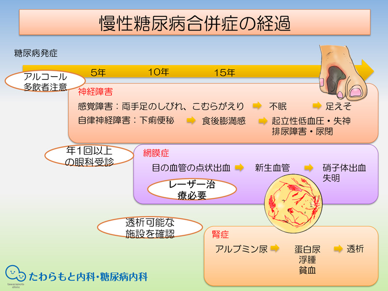 糖尿病が10年以上続いたりすると、徐々に他の体の部位や臓器に影響がでてきます。それらを合併症と呼びます。
