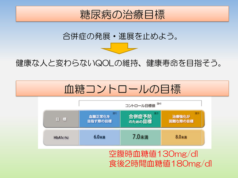 糖糖尿病治療の目的は、糖尿病単独もしくは糖尿病合併症進行に伴って起こる自覚症状増悪を少しでも抑制し、非糖尿病者と変わらない生活の質を維持してもらうことにあります。